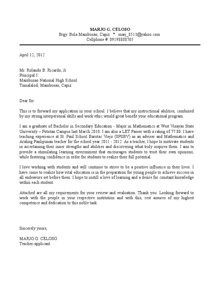 Sample application letter for secondary teacher (deped). This rule of thumb applies while writing applications for teaching jobs you can use these samples as templates while writing your own teaching job applications. A job application letters for teacher primarily explains the qualification and education background of the applicant along with their relevant work experience. 8 how to properly resign from teaching? An english teacher cover letter is considered the best if it shows energy.